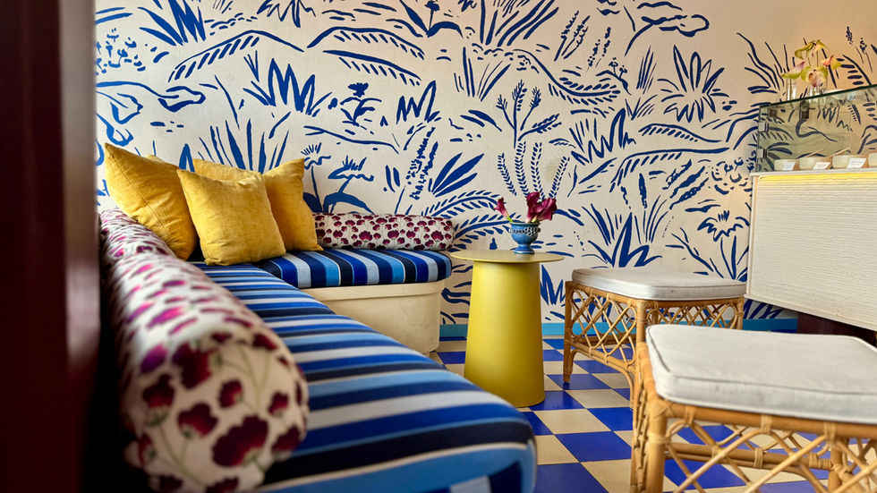 The design takes subtle Mediterranean cues through the brand colors and a signature pattern. Textured walls and furniture, along with fiber elements in the lighting, add depth. The goal was to create a boutique-style Greek frozen yogurt shop, with a small sitting area as the most memorable spot, all unified by an indigo and off-white checker floor.